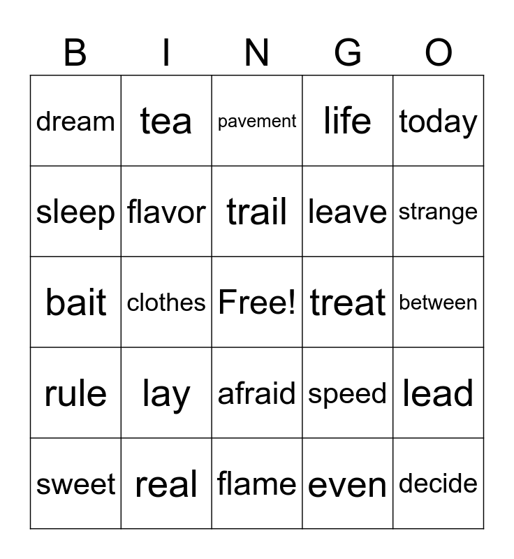 This bingo card has a free space and 24 words: lay, real, trail, sweet, today, dream, sleep, tea, treat, afraid, leave, bait, speed, lead, flavor, even, between, pavement, strange, clothes, decide, rule, life and flame.