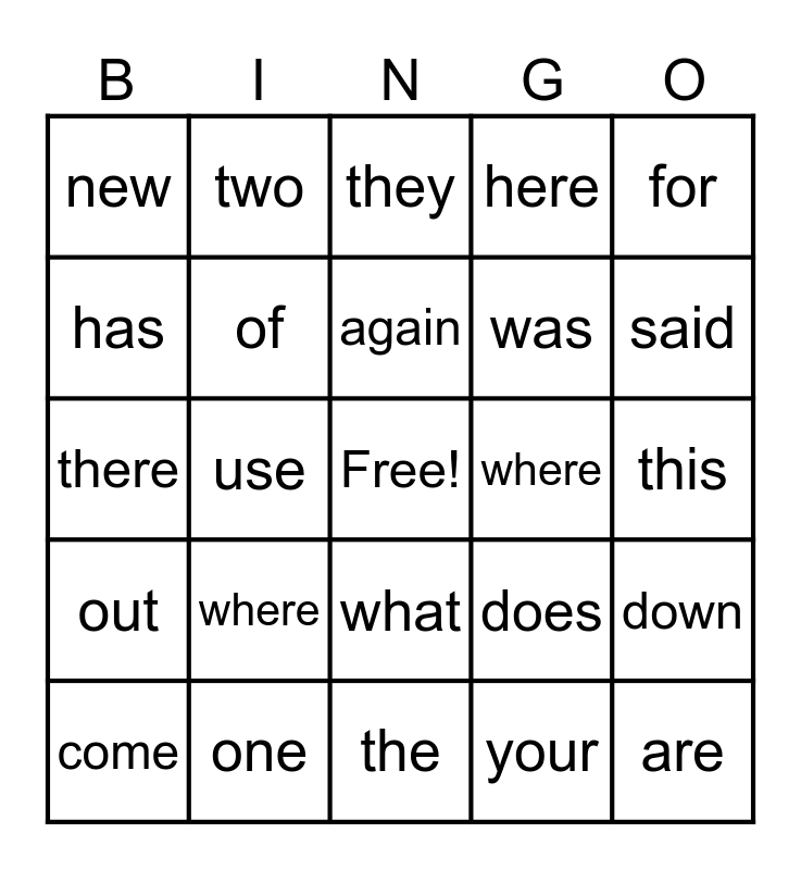This bingo card has a free space and 24 words: where, one, again, come, for, new, has, two, where, what, was, there, does, down, of, your, this, they, said, use, are, out, here and the.
