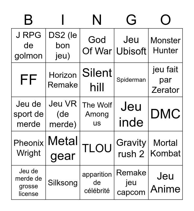 This bingo card has a free space and 24 words: Metal gear, Silksong, Silent hill, Jeu de merde de grosse license, Monster Hunter, J RPG de golmon, FF, DS2 (le bon jeu), Jeu inde, TLOU, Spiderman, Jeu de sport de merde, Gravity rush 2, Mortal Kombat, Horizon Remake, Remake jeu capcom, DMC, God Of War, jeu fait par Zerator, Jeu VR (de merde), Jeu Anime, Pheonix Wright, Jeu Ubisoft and apparition de célébrité.