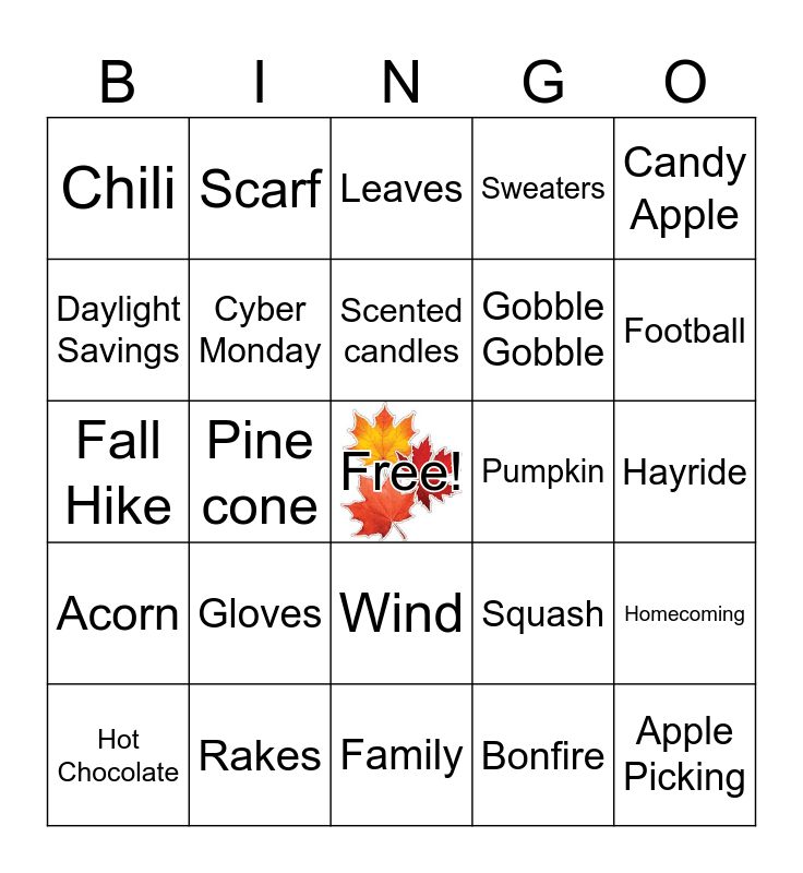 This bingo card has a free space and 45 words: Harvest, Apple Picking, Corn Maze, Hot Chocolate, Cider, Bonfire, Leaves, Give Thanks, Candy Apple, Rakes, Sweaters, Pumpkin, Wind, Gloves, Gather, Family, Frost, Fall Hike, Pumpkin Spice, Football, Scarf, Apple Cider Donuts, Pie, Chili, Scarecrow, Hayride, Foliage, Flannel, Squash, Acorn, Corn, Homecoming, Turkey, S'mores, Fuzzy socks, Pine cone, Traditions, Caramel, Blankets, Scented candles, Daylight Savings, Gobble Gobble, Black Friday, Cyber Monday and Giving Tuesday.
