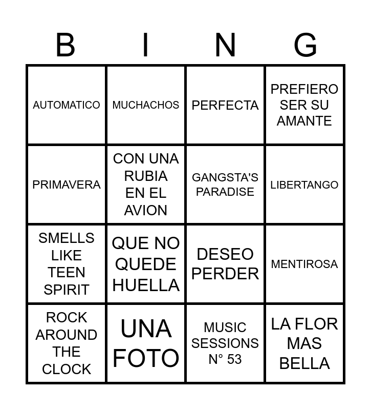 This bingo card has 100 words: Free!, NO TE CREAS TAN IMPORTANTE, MUSIC SESSIONS N° 53, RELACION, OJOS VERDES, ENVOLVER, IS THIS LOVE?, CON LOS OJOS CERRADOS, FLOWERS, SãO AMORES, FUERTE NO SOY, El BAILONGO EN LO DEL RENGO, POBRE CORAZON, LA LUNA, SINFONIA N° 40 - MOZART, ...BABY ONE MORE TIME, SMELLS LIKE TEEN SPIRIT, ELLA TIENE, CRAZY, SI TE SENTIS SOLA, WILDFLOWER, PERSIANA AMERICANA, LA FELICIDAD, RUNAWAY, PERDONARTE, PARA QUE, UNA FOTO, PRIMAVERA, EN LA INTIMIDAD, HOLA PERDIDA, IMAGINE, MENTIROSA, AUTOMATICO, SAN TURRONA, MARIPOSA TECNICOLOR, EL AMOR DE MI VIDA, LIBERTANGO, WORK, TASTE, FACETIME, BLINDING LIGHTS, LA CUMBIA DE LOS TRAPOS, MELON VINO, DESEO PERDER, TAMBIÉN, QUE NO QUEDE HUELLA, PERFECTA, NO PONGA EXCUSAS, CUANDO TE VI, AMOR SALVAJE, TU FALTA DE QUERER, SI ANTES TE HUBIERA CONOCIDO, HOY, STAND BY ME, IRRESPONSABLES, MIL HORAS, SINVERGÜENZA, INOCENTE, ILUMINARA, MOMENTO PARA DECIR ADIOS, PREFIERO SER SU AMANTE, DESESPERADA, Y.M.C.A, ALFONSINA Y EL MAR, ANOTHER BRICK IN THE WALL, QUE PASARA, LATINOAMERICA, BOHEMIAN RHAPSODY, YO NO TE MEREZCO, FAMA DE DIABLA, VICIO, FLORES AMARILLAS, CABILDO Y JURAMENTO, SABALERO, FUE LO MEJOR DEL AMOR, BILLIE JEAN, MI ENFERMEDAD, QUIERO GRITAR QUE TE QUIERO, CON UNA RUBIA EN EL AVION, LLORANDO SE FUE, EL RITMO NEGRO, NO ME ARREPIENTO DE ESTE AMOR, ROCK AROUND THE CLOCK, JAILHOUSE ROCK, WHAT IS LOVE, SERA QUE NO ME AMAS, MUCHACHOS, TOMATE EL PALO, LA MOROCHA, LA TRAMPA, LA FLOR MAS BELLA, BALDERRAMA, LADY MARMOLADE, WANNABE, BYE BYE BYE, GANGSTA'S PARADISE, YA NO VUELVAS, EL NO VA A VENIR, ASI NO TE AMARA JAMAS, PUERTO MONTT and MARINERO DE LUCES.