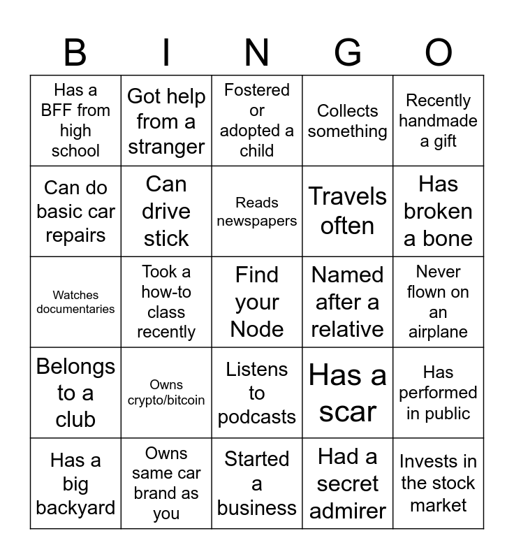This bingo card has a free space and 69 words: Has a side hustle, Never flown on an airplane, Same birth month as you, Traveled in the last year, Owns same car brand as you, Never learned to ride a bike, Collects something, Goes all-out on holiday decorating, Recently handmade a gift, Received an award, Has performed in public, Has a phobia, Has a BFF from high school, Fostered or adopted a child, Currently a student, Took a how-to class recently, Listens to podcasts, Travels often, Attended high school reunion, Belongs to a club, Named after a relative, Has a scar, Has broken a bone, Has a nickname, Has a bucket list, Makes New Year’s resolutions, Good cook, Taught a class, Had a secret admirer, Helped a stranger, Got help from a stranger, Worked at a family business, Had a long-distance relationship, Took dance lessons, Speaks 4+ languages, Can code, Can bake a cake from scratch, Knows the whole periodic table, Can do basic car repairs, Was in a wedding party this year, Owns crypto/bitcoin, Invests in the stock market, Climbed a mountain, Moved in the past year, Owns a boat, Has a big backyard, Digital nomad, Lives near a coffee shop, Lives in a rural area, Can drive stick, Reads newspapers, Does stand up comedy, Owns a vacation house, Started a business, Is a Firefighter or EMT, Has been in a hot air balloon, Has taken a cruise, Won a race, Ran in a marathon, Watches documentaries, Knows calligraphy, Built an app, Work fact: Digital Workplace Transformation, Work fact: Digital Workplace Experience, Work fact: Communications & Training, Work fact: Digital Workplace Planning & Design, Work fact: Digital Workplace Foundational Technology, Work fact: Operational Initiatives and Work fact: Digital Workplace Operations.