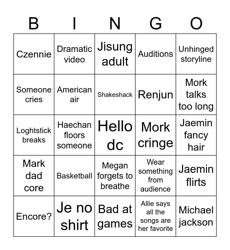 This bingo card has a free space and 24 words: Basketball, Je no shirt, Shakeshack, Encore?, Unhinged storyline, Czennie, Someone cries, Dramatic video, Mork cringe, Megan forgets to breathe, Renjun, Loghtstick breaks, Wear something from audience, Jaemin flirts, American air, Allie says all the songs are her favorite, Jaemin fancy hair, Jisung adult, Mork talks too long, Haechan floors someone, Michael jackson, Mark dad core, Auditions and Bad at games.