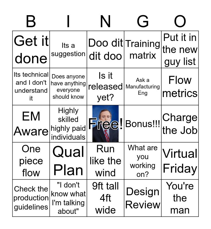 This bingo card has a free space and 24 words: Qual Plan, "I don't know what I'm talking about", Is it released yet?, Check the production guidelines, Put it in the new guy list, Get it done, Its technical and I don't understand it, Its a suggestion, Bonus!!!, Run like the wind, Ask a Manufacturing Eng, EM Aware, What are you working on?, Virtual Friday, Does anyone have anything everyone should know, Design Review, Charge the Job, Doo dit dit doo, Flow metrics, Highly skilled highly paid individuals, You're the man, One piece flow, Training matrix and 9ft tall 4ft wide.