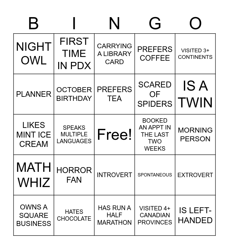 This bingo card has a free space and 24 words: HORROR FAN, HATES CHOCOLATE, PREFERS TEA, OWNS A SQUARE BUSINESS, VISITED 3+ CONTINENTS, NIGHT OWL, PLANNER, FIRST TIME IN PDX, BOOKED AN APPT IN THE LAST TWO WEEKS, INTROVERT, SCARED OF SPIDERS, LIKES MINT ICE CREAM, SPONTANEOUS, EXTROVERT, OCTOBER BIRTHDAY, VISITED 4+ CANADIAN PROVINCES, MORNING PERSON, CARRYING A LIBRARY CARD, IS A TWIN, SPEAKS MULTIPLE LANGUAGES, IS LEFT-HANDED, MATH WHIZ, PREFERS COFFEE and HAS RUN A HALF MARATHON.