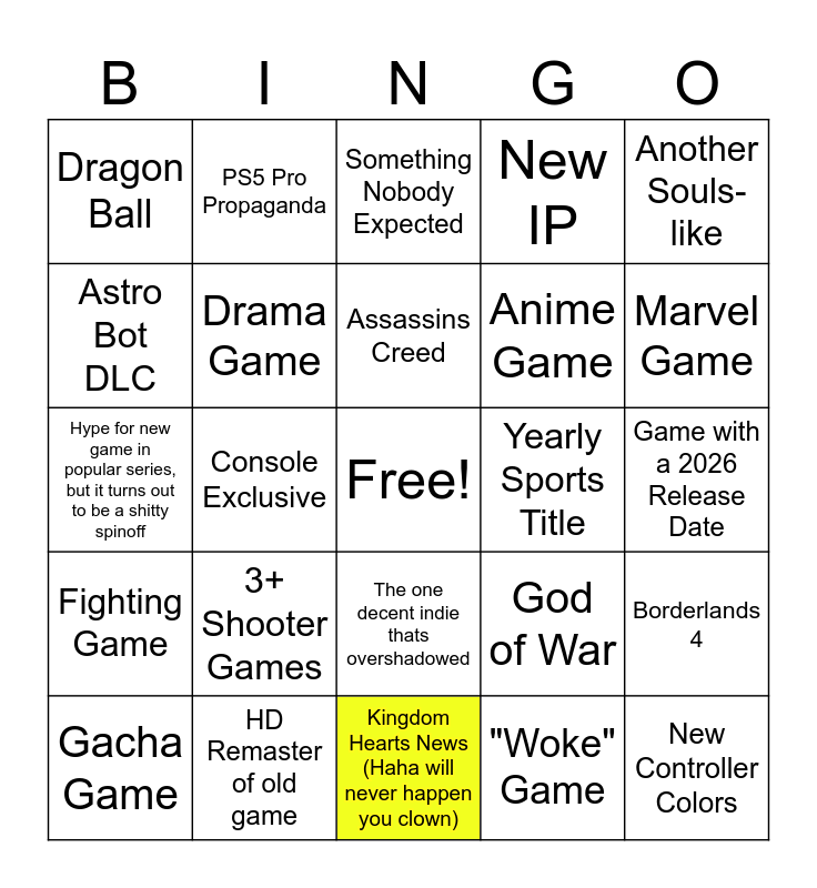 This bingo card has a free space and 24 words: 3+ Shooter Games, HD Remaster of old game, Assassins Creed, Gacha Game, Another Souls-like, Dragon Ball, Astro Bot DLC, PS5 Pro Propaganda, Yearly Sports Title, The one decent indie thats overshadowed, Anime Game, Hype for new game in popular series, but it turns out to be a shitty spinoff, God of War, Borderlands 4, Drama Game, "Woke" Game, Game with a 2026 Release Date, Something Nobody Expected, Marvel Game, Console Exclusive, New Controller Colors, Fighting Game, New IP and Kingdom Hearts News (Haha will never happen you clown).
