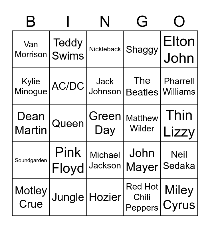 This bingo card has 40 words: Journey, Dean Martin, Lenny Kravitz, AC/DC, Jungle, Michael Jackson, Jack Johnson, Carrie Underwood, Elton John, Soundgarden, Queen, Shaggy, Green Day, Thin Lizzy, Matthew Wilder, Pink Floyd, Commodores, Van Morrison, Bob Marley & The Wailers, Nickleback, Neil Sedaka, Red Hot Chili Peppers, The Beatles, Kylie Minogue, Frankie Valli and The Four Seasons, Fleetwood Mac, Zac Brown Band, Frank Sinatra, Miley Cyrus, ABBA, Lynyrd Skynyrd, Motley Crue, Cheryl Lynn, John Mayer, Pharrell Williams, Hozier, Billie Eilish, Doja Cat, Teddy Swims and Aqua.