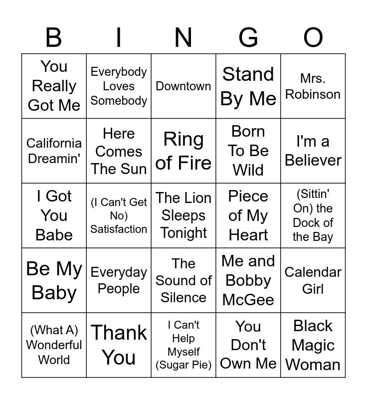 This bingo card has a free space and 39 words: Oh, Pretty Woman, Can't Help Falling in Love, Brown Eyed Girl, Here Comes The Sun, (What A) Wonderful World, The Sound of Silence, Ring of Fire, Fortunate Son, Mrs. Robinson, Be My Baby, (I Can't Get No) Satisfaction, Stand By Me, Black Magic Woman, (Sittin' On) the Dock of the Bay, Piece of My Heart, Everyday People, Bad Moon Rising, You Really Got Me, Purple Haze, Me and Bobby McGee, California Dreamin', I Can't Help Myself (Sugar Pie), Born To Be Wild, I'm a Believer, It's Your Thing, Do You Believe Magic?, I Got You (I Feel Good), Good Vibrations, Mr. Sandman, Everybody Loves Somebody, Breaking Up Is Hard to Do, Return to Sender, Downtown, Thank You, You Don't Own Me, A Change Is Gonna Come, Calendar Girl, I Got You Babe and Don't Rain on My Parade.