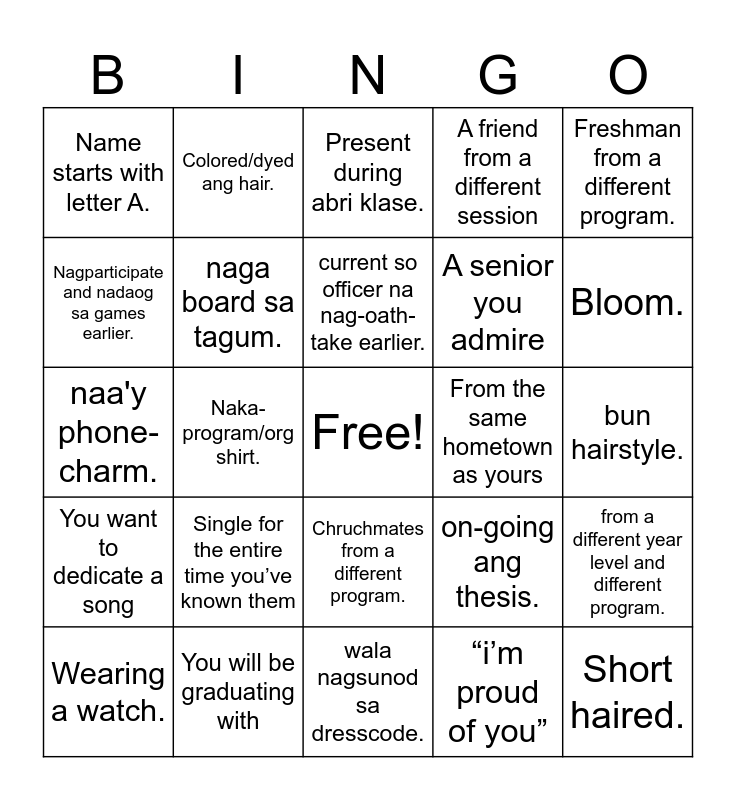 This bingo card has a free space and 25 words: Single for the entire time you’ve known them, wala nagsunod sa dresscode., current so officer na nag-oath-take earlier., Wearing a watch., Freshman from a different program., Name starts with letter A., Nagparticipate and nadaog sa games earlier., Colored/dyed ang hair., From the same hometown as yours, Chruchmates from a different program., A senior you admire, naa'y phone-charm., on-going ang thesis., from a different year level and different program., naga board sa tagum., first-timer pakigsandurot (DASE general assembly) attendee., bun hairstyle., Present during abri klase., Bloom., Naka-program/org shirt., Short haired., You will be graduating with, You want to dedicate a song, A friend from a different session and “i’m proud of you”.