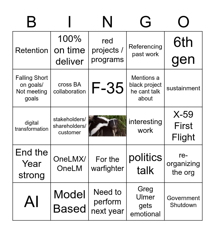 This bingo card has a free space and 24 words: OneLMX/ OneLM, Model Based, F-35, AI, 6th gen, Retention, Falling Short on goals/ Not meeting goals, 100% on time deliver, interesting work, For the warfighter, Mentions a black project he cant talk about, digital transformation, politics talk, re-organizing the org, cross BA collaboration, Greg Ulmer gets emotional, X-59 First Flight, red projects / programs, sustainment, stakeholders/ shareholders/ customer, Government Shutdown, End the Year strong, Referencing past work and Need to perform next year.