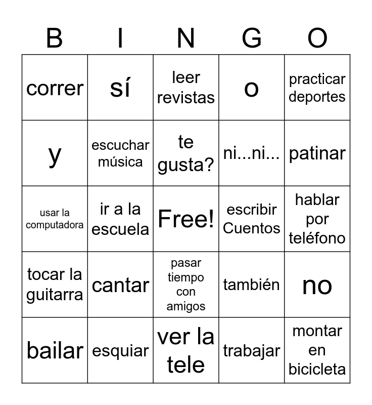 This bingo card has a free space and 29 words: bailar, montar en monopatín, ir a la escuela, dibujar, correr, leer revistas, escuchar música, cantar, escribir Cuentos, esquiar, hablar por teléfono, montar en bicicleta, ver la tele, trabajar, patinar, nadar, pasar tiempo con amigos, tocar la guitarra, practicar deportes, usar la computadora, también, pues..., ni...ni..., y, o, sí, no, te gusta? and me gusta.