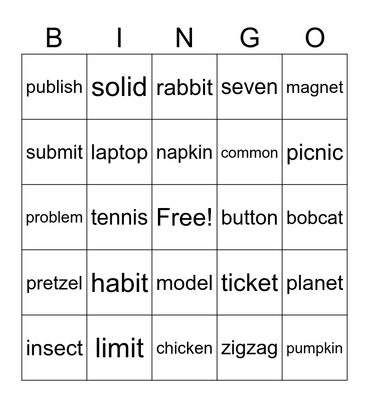 This bingo card has a free space and 24 words: habit, limit, napkin, insect, magnet, publish, submit, solid, button, model, common, problem, ticket, planet, laptop, zigzag, bobcat, rabbit, picnic, tennis, pumpkin, pretzel, seven and chicken.