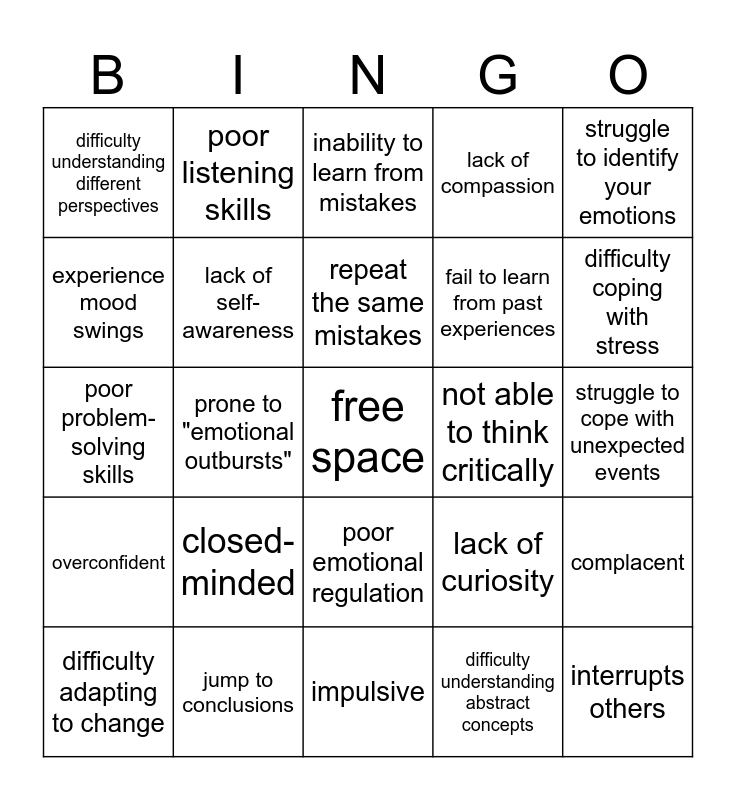 This bingo card has a free space and 24 words: closed-minded, jump to conclusions, repeat the same mistakes, difficulty adapting to change, struggle to identify your emotions, difficulty understanding different perspectives, experience mood swings, poor listening skills, not able to think critically, poor emotional regulation, fail to learn from past experiences, poor problem-solving skills, lack of curiosity, complacent, lack of self-awareness, difficulty understanding abstract concepts, struggle to cope with unexpected events, inability to learn from mistakes, difficulty coping with stress, prone to "emotional outbursts", interrupts others, overconfident, lack of compassion and impulsive.