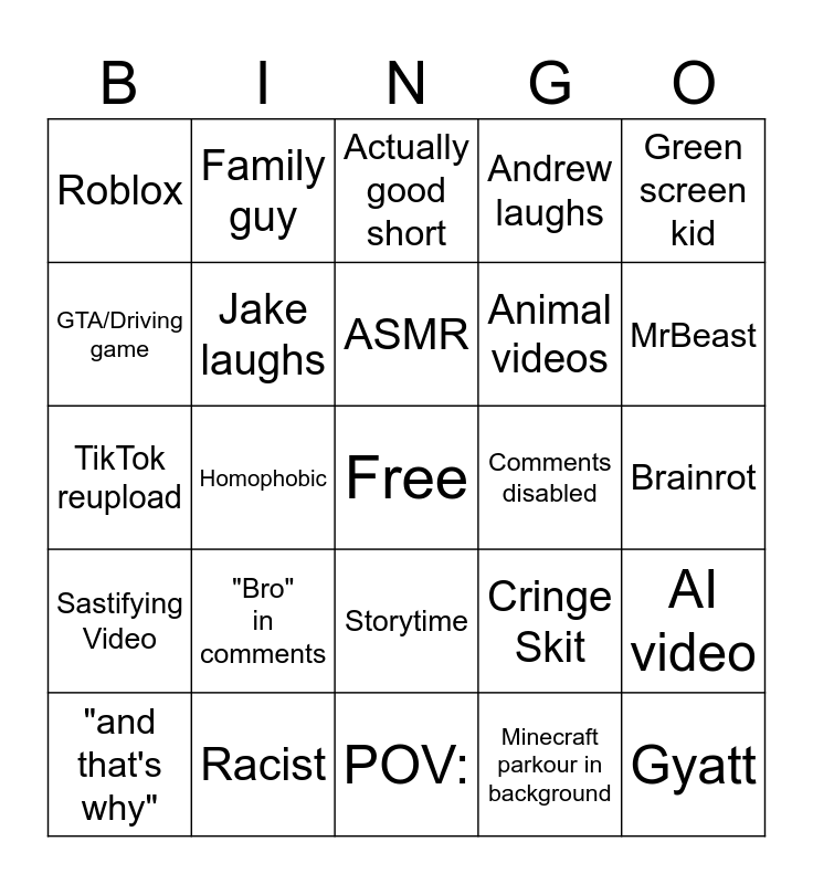 This bingo card has a free space and 24 words: "Bro" in comments, Racist, ASMR, "and that's why", Green screen kid, Roblox, GTA/Driving game, Family guy, Comments disabled, Storytime, Animal videos, TikTok reupload, Cringe Skit, AI video, Jake laughs, Minecraft parkour in background, Brainrot, Actually good short, MrBeast, Homophobic, Gyatt, Sastifying Video, Andrew laughs and POV:.
