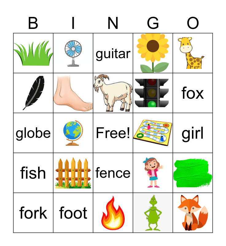 This bingo card has 24 images, a free space and 24 words: frog, fox, fork, fire, fence, fish, fan, face, feather, football, foot, flower, green, girl, gum, ghost, goat, game, guitar, giraffe, globe, Grinch, grass and go.