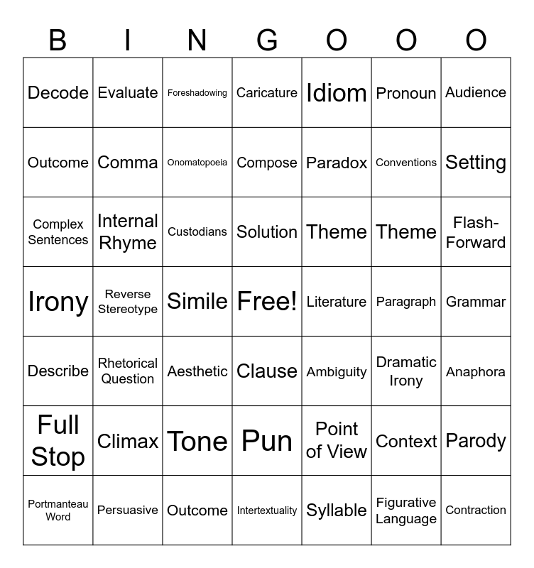 This bingo card has a free space and 119 words: Alliteration, Allusion, Ambiguity, Analogy, Aphorism, Atmosphere, Caricature, Character, Circular Story, Climax, Conflict, Dialogue, Dramatic Irony, Episode, Event, Outcome, Solution, Monologue, Evidence, Flashback, Flash-Forward, Foreshadowing, Hyperbole, Imagery, Inference, Internal Rhyme, Irony, Dramatic Irony, Metaphor, Motive, Onomatopoeia, Outcome, Paradox, Parallel Story, Parody, Personification, Plot, Poetic Justice, Point of View, First Person, Omniscient, Third Person, Portmanteau Word, Compound Words, Pun, Repetition, Setting, Simile, Stereotype, Reverse Stereotype, Symbol, Theme, Tone, Trait, Understatement, Adjective, Adverb, Adverbial Clause, Adverbial Phrase, Aesthetic, Anaphora, Antonym, Apostrophe, Appositive, Argument, Audience, Characterisation, Clause, Comma, Compose, Compare, Complex Sentences, Connotation, Consonant, Construct, Context, Contraction, Conventions, Custodians, Decode, Define, Demonstrate, Describe, Dialogue, Digraph, Discursive, Diversity, Encode, Evaluate, Examine, Explain, Figurative Language, Full Stop, Genre, Grammar, Hyphenation, Idiom, Imaginative Text, Inference, Interpret, Justify, Intertextuality, Literature, Metaphor, Modality, Narrative, Non-Fiction, Paragraph, Persuasive, Poetry, Prefix, Pronoun, Representation, Rhetorical Question, Sentence, Suffix, Syllable, Theme and Tense.