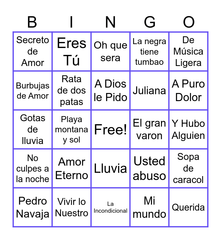 This bingo card has a free space and 50 words: Bésame Mucho, Querida, La Gota Fría, La Incondicional, Amor Eterno, Quimbara, Eres Tú, Mi Cucu, Burbujas de Amor, Color Esperanza, Rata de dos patas, La negra tiene tumbao, Sopa de caracol, Usted abuso, Perfidia, Bachata Rosa, A Dios le Pido, El gran varon, La Maldita Primavera, De Música Ligera, Playa montana y sol, Mi mundo, Secreto de Amor, Juliana, Si Nos Dejan, El Triste, A Puro Dolor, Lloraras, Oh que sera, Lluvia, Abrázame Muy Fuerte, El Rey, Muevelo, Mireya, Vivir lo Nuestro, Mi mayor venganza, Matador, Mi Buen Amor, Hasta Que Te Conocí, Y Hubo Alguien, La Chica de Humo, El sonidito, La niña fresa, Se Me Olvidó Otra Vez, Pedro Navaja, Gotas de lluvia, Sukiyaki, Procura, No culpes a la noche and Bonita.