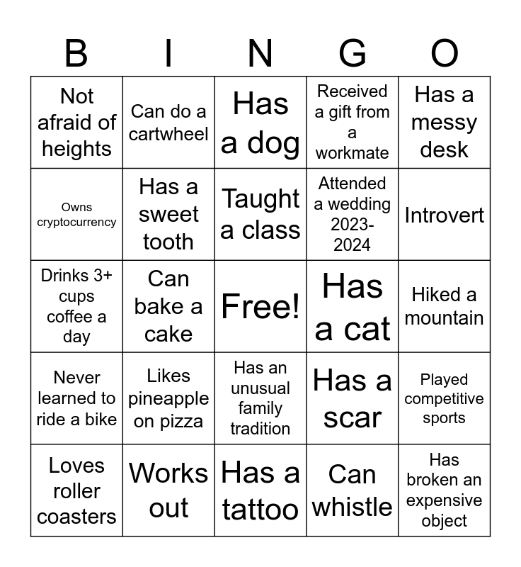 This bingo card has a free space and 25 words: Likes pineapple on pizza, Has a tattoo, Taught a class, Loves roller coasters, Has a messy desk, Not afraid of heights, Owns cryptocurrency, Can do a cartwheel, Has a cat, Has an unusual family tradition, Attended a wedding 2023-2024, Drinks 3+ cups coffee a day, Has a scar, Played competitive sports, Has a sweet tooth, Knows how to swim, Hiked a mountain, Has a dog, Introvert, Can bake a cake, Has broken an expensive object, Works out, Never learned to ride a bike, Received a gift from a workmate and Can whistle.