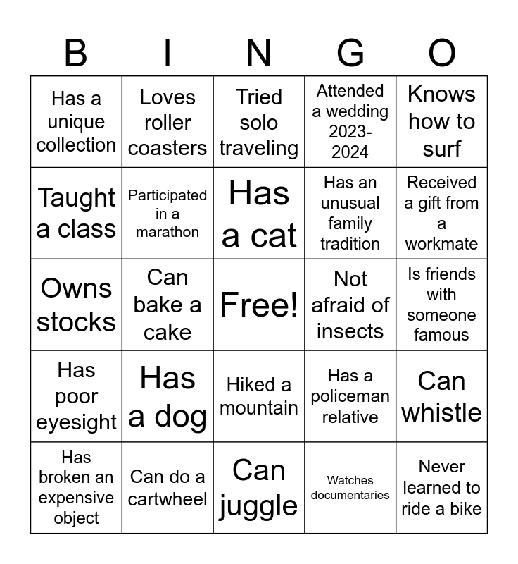 This bingo card has a free space and 25 words: Has a dog, Can juggle, Has a cat, Has broken an expensive object, Knows how to surf, Has a unique collection, Taught a class, Loves roller coasters, Not afraid of insects, Hiked a mountain, Has an unusual family tradition, Owns stocks, Has a policeman relative, Can whistle, Participated in a marathon, Has an unusual phobia, Is friends with someone famous, Tried solo traveling, Received a gift from a workmate, Can bake a cake, Never learned to ride a bike, Can do a cartwheel, Has poor eyesight, Attended a wedding 2023-2024 and Watches documentaries.