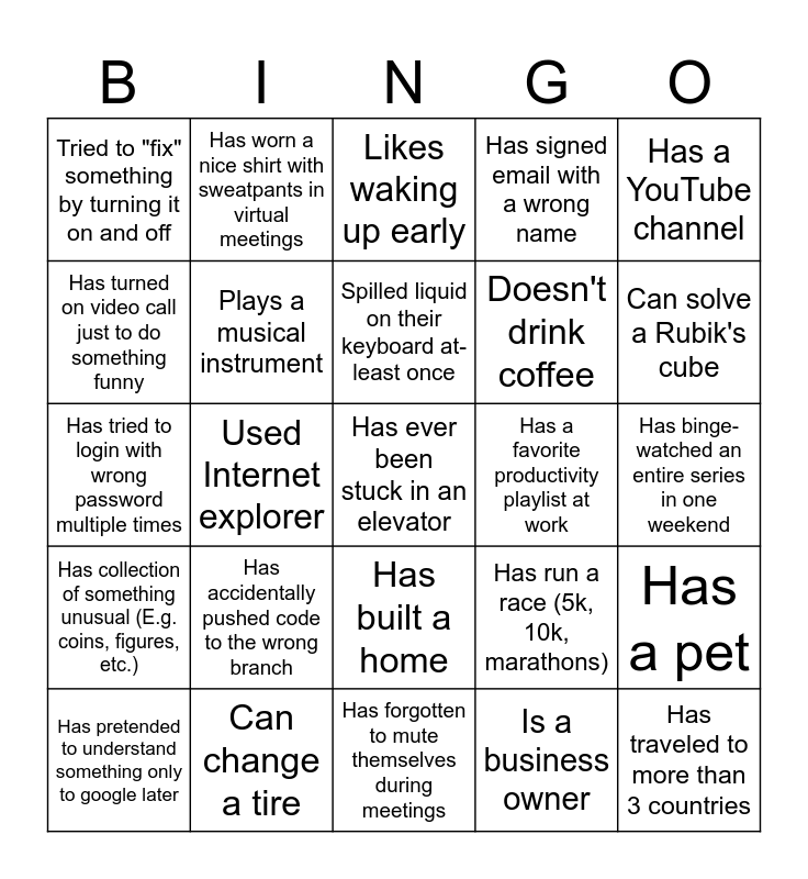 This bingo card has 25 words: Has accidentally pushed code to the wrong branch, Has forgotten to mute themselves during meetings, Spilled liquid on their keyboard at-least once, Has pretended to understand something only to google later, Has a YouTube channel, Tried to "fix" something by turning it on and off, Has turned on video call just to do something funny, Has worn a nice shirt with sweatpants in virtual meetings, Has a favorite productivity playlist at work, Has built a home, Doesn't drink coffee, Has tried to login with wrong password multiple times, Has run a race (5k, 10k, marathons), Has a pet, Plays a musical instrument, Has traveled to more than 3 countries, Has binge-watched an entire series in one weekend, Likes waking up early, Can solve a Rubik's cube, Used Internet explorer, Has ever been stuck in an elevator, Can change a tire, Has collection of something unusual (E.g. coins, figures, etc.), Has signed email with a wrong name and Is a business owner.