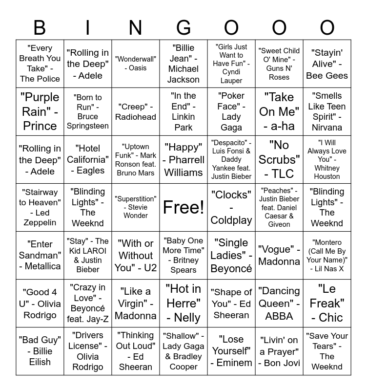 This bingo card has a free space and 60 words: "Imagine" - John Lennon, "Stairway to Heaven" - Led Zeppelin, "Bohemian Rhapsody" - Queen, "Hotel California" - Eagles, "Superstition" - Stevie Wonder, "Dancing Queen" - ABBA, "Stayin' Alive" - Bee Gees, "What's Going On" - Marvin Gaye, "Born to Run" - Bruce Springsteen, "Le Freak" - Chic, "Billie Jean" - Michael Jackson, "Like a Virgin" - Madonna, "Sweet Child O' Mine" - Guns N' Roses, "With or Without You" - U2, "Livin' on a Prayer" - Bon Jovi, "Every Breath You Take" - The Police, "Take On Me" - a-ha, "Girls Just Want to Have Fun" - Cyndi Lauper, "I Wanna Dance with Somebody" - Whitney Houston, "Purple Rain" - Prince, "Smells Like Teen Spirit" - Nirvana, "Wonderwall" - Oasis, "I Will Always Love You" - Whitney Houston, "No Scrubs" - TLC, "My Heart Will Go On" - Celine Dion, "Baby One More Time" - Britney Spears, "Enter Sandman" - Metallica, "Killing Me Softly" - The Fugees, "Creep" - Radiohead, "Vogue" - Madonna, "Hey Ya!" - OutKast, "Crazy in Love" - Beyoncé feat. Jay-Z, "Lose Yourself" - Eminem, "Hips Don’t Lie" - Shakira feat. Wyclef Jean, "Rolling in the Deep" - Adele, "Clocks" - Coldplay, "Hot in Herre" - Nelly, "Poker Face" - Lady Gaga, "Single Ladies" - Beyoncé, "In the End" - Linkin Park, "Shape of You" - Ed Sheeran, "Uptown Funk" - Mark Ronson feat. Bruno Mars, "Rolling in the Deep" - Adele, "Old Town Road" - Lil Nas X, "Despacito" - Luis Fonsi & Daddy Yankee feat. Justin Bieber, "Blinding Lights" - The Weeknd, "Bad Guy" - Billie Eilish, "Thinking Out Loud" - Ed Sheeran, "Shallow" - Lady Gaga & Bradley Cooper, "Happy" - Pharrell Williams, "Blinding Lights" - The Weeknd, "Levitating" - Dua Lipa, "Good 4 U" - Olivia Rodrigo, "Peaches" - Justin Bieber feat. Daniel Caesar & Giveon, "Stay" - The Kid LAROI & Justin Bieber, "Montero (Call Me By Your Name)" - Lil Nas X, "Drivers License" - Olivia Rodrigo, "Bad Habits" - Ed Sheeran, "Save Your Tears" - The Weeknd and "As It Was" - Harry Styles.