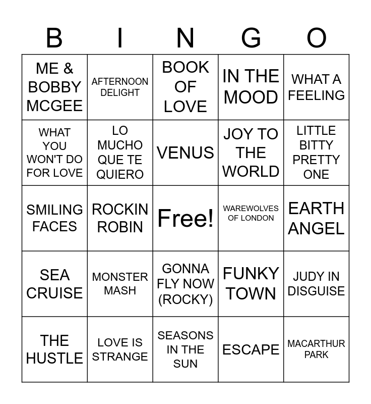 This bingo card has a free space and 25 words: MONSTER MASH, SEASONS IN THE SUN, VENUS, THE HUSTLE, WHAT A FEELING, ME & BOBBY MCGEE, WHAT YOU WON'T DO FOR LOVE, AFTERNOON DELIGHT, WAREWOLVES OF LONDON, GONNA FLY NOW (ROCKY), JOY TO THE WORLD, SMILING FACES, FUNKY TOWN, JUDY IN DISGUISE, LO MUCHO QUE TE QUIERO, BATMAN, EARTH ANGEL, BOOK OF LOVE, LITTLE BITTY PRETTY ONE, ROCKIN ROBIN, MACARTHUR PARK, LOVE IS STRANGE, SEA CRUISE, IN THE MOOD and ESCAPE.
