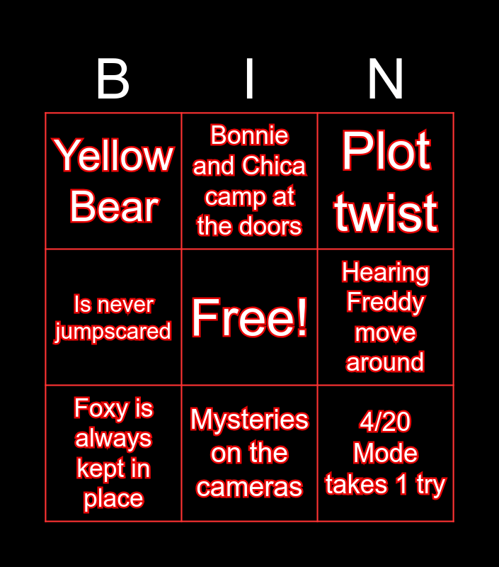 This bingo card has a free space and 8 words: Is never jumpscared, Bonnie and Chica camp at the doors, Hearing Freddy move around, Foxy is always kept in place, Plot twist, Yellow Bear, Mysteries on the cameras and 4/20 Mode takes 1 try.