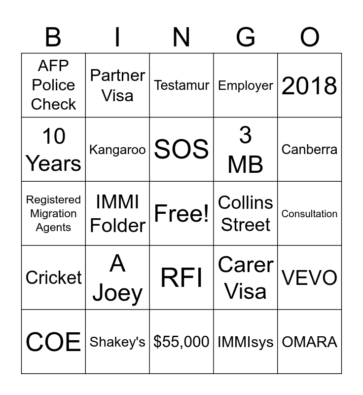 This bingo card has a free space and 24 words: A Joey, Shakey's, SOS, COE, 2018, AFP Police Check, 10 Years, Partner Visa, Collins Street, RFI, 3 MB, Registered Migration Agents, Carer Visa, VEVO, Kangaroo, IMMIsys, Consultation, Testamur, Canberra, IMMI Folder, OMARA, Cricket, Employer and $55,000.