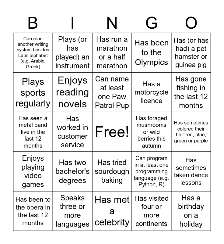 This bingo card has a free space and 24 words: Has two bachelor's degrees, Speaks three or more languages, Can name at least one Paw Patrol Pup, Has been to the opera in the last 12 months, Has (or has had) a pet hamster or guinea pig, Can read another writing system besides Latin alphabet (e.g. Arabic, Greek), Plays sports regularly, Plays (or has played) an instrument, Has foraged mushrooms or wild berries this autumn, Has tried sourdough baking, Has a motorcycle licence, Has seen a metal band live in the last 12 months, Can program in at least one programming language (e.g. Python, R), Has sometimes taken dance lessons, Enjoys reading novels, Has visited four or more continents, Has sometimes colored their hair red, blue, green or purple, Has run a marathon or a half marathon, Has gone fishing in the last 12 months, Has worked in customer service, Has a birthday on a holiday, Enjoys playing video games, Has been to the Olympics and Has met a celebrity.