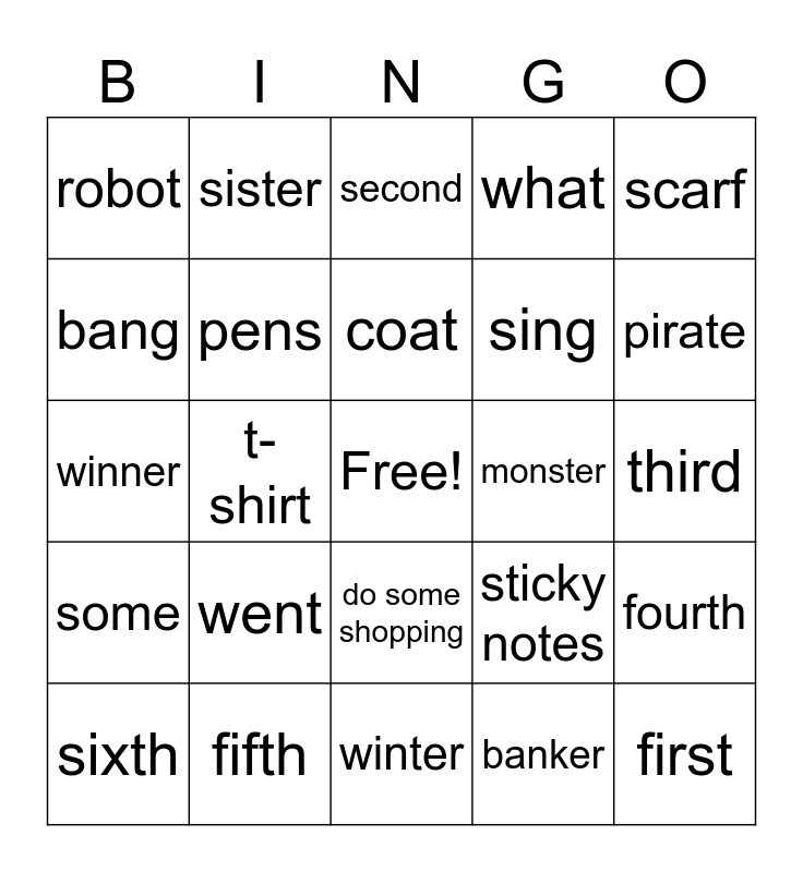 This bingo card has a free space and 36 words: erasers, markers, pencils, pens, sticky notes, some, coat, hat, scarf, sweater, t-shirt, what, ghost, monster, pirate, robot, space, went, first, second, third, fourth, fifth, sixth, winter, sister, winner, ring, sing, bang, sang, bank, banker, do some shopping, eat some ice cream and get some soda.