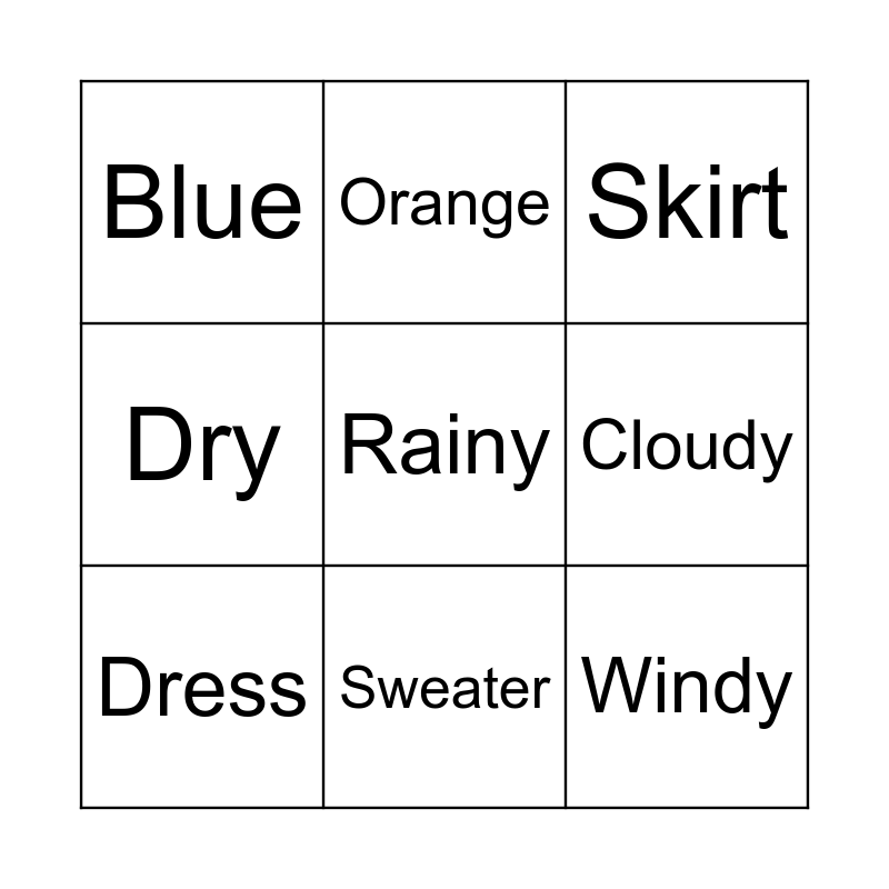This bingo card has a free space and 20 words: Boots, Green, Skirt, Stormy, Sunny, Windy, Yellow, Blue, Black, Orange, White, Umbrella, Cloudy, Wed, Dress, Rainbow, Sweater, Dry, Cold and Warm.