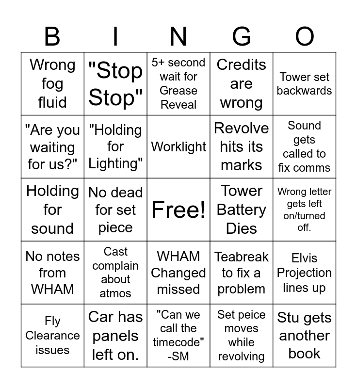 This bingo card has a free space and 31 words: "Can we call the timecode" -SM, Lemon and White Dead?, No dead for set piece, Phone Torch used onstage, Wrong fog fluid, 5+ second wait for Grease Reveal, "Holding for Lighting", Teabreak to fix a problem, Tower Battery Dies, Set peice moves while revolving, Wrong letter gets left on/turned off., Stu gets another book, Scene change happens smoothly!, "Someones Latched.", Sound gets called to fix comms, "Is that on its Marks?", Elvis Projection lines up, Cast complain about atmos, No notes from WHAM, WHAM Changed missed, Tower set backwards, "Rydell High" Spelt wrong, Fly Clearance issues, "Stop Stop", Revolve hits its marks, "Are you waiting for us?", Credits are wrong, Holding for sound, Car has panels left on., Worklight and Crew visible where they shouldn't be..