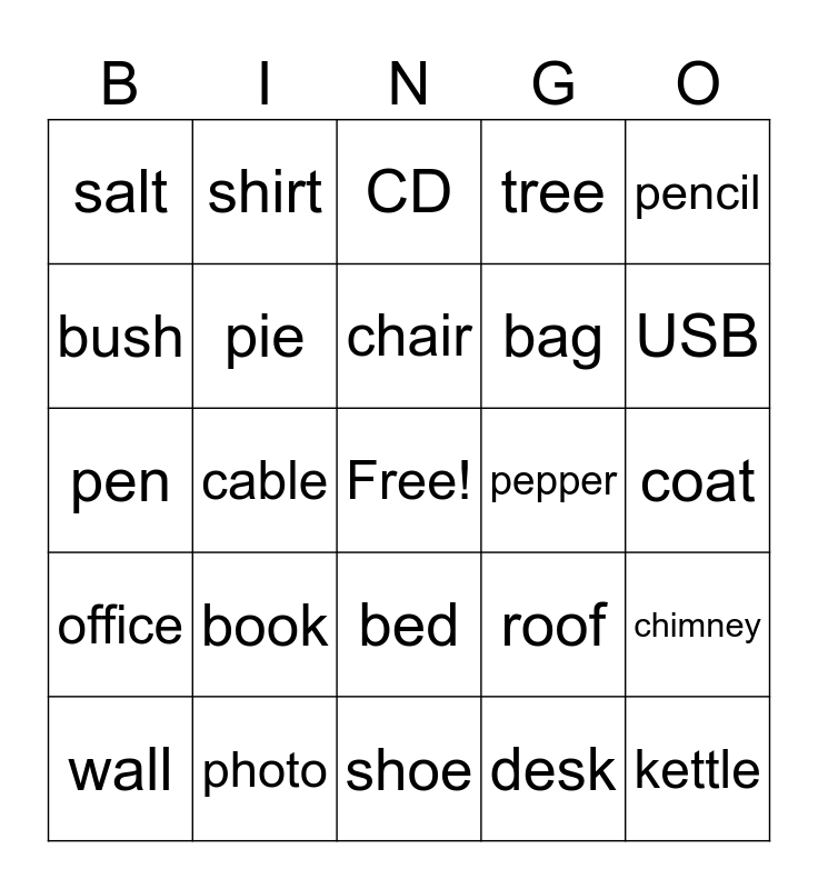 This bingo card has a free space and 35 words: bat, ball, apple, pie, bed, tree, bush, table, chair, watch, pen, pencil, phone, PC, salt, pepper, desk, cable, office, kettle, roof, wall, chimney, photo, CD, USB, car, bike, bag, coat, hat, shoe, book, shirt and cup.