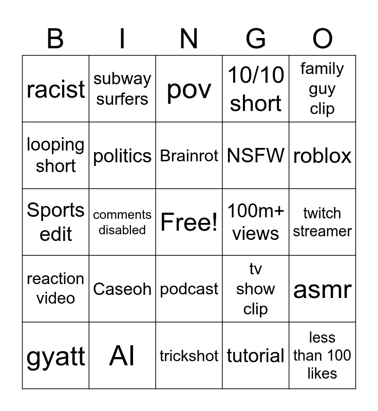 This bingo card has a free space and 24 words: Caseoh, AI, Brainrot, gyatt, family guy clip, racist, looping short, subway surfers, 100m+ views, podcast, NSFW, Sports edit, tv show clip, asmr, politics, tutorial, twitch streamer, pov, roblox, comments disabled, less than 100 likes, reaction video, 10/10 short and trickshot.