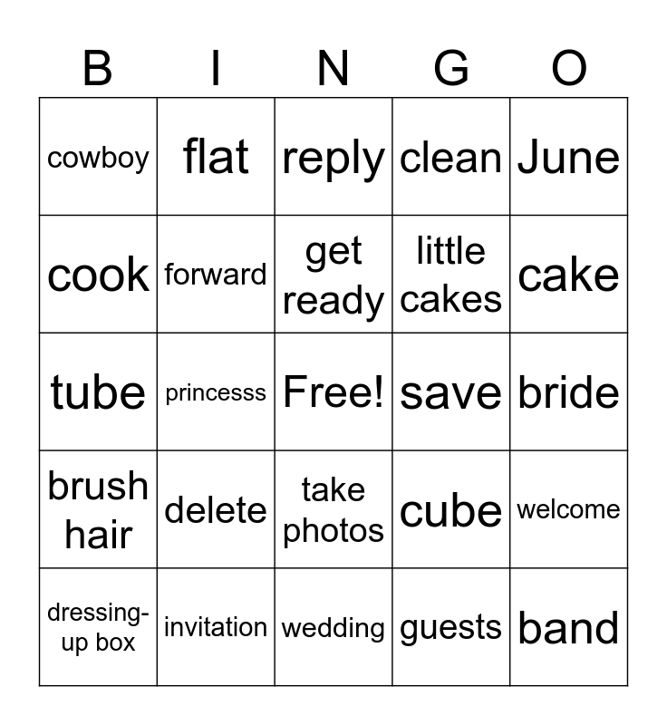 This bingo card has a free space and 29 words: dressing-up box, crown, princesss, pirate, cowboy, reply, forward, delete, save, invitation, bride, band, wedding, guests, cake, flute, take photos, brush hair, June, tube, cube, summer party, little cakes, cook, clean, flat, welcome, get ready and living room.