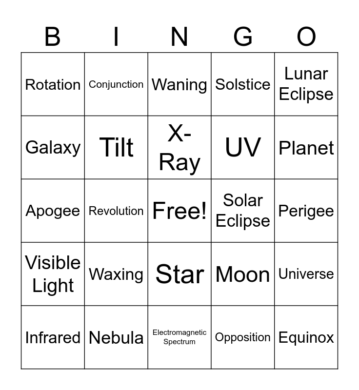 This bingo card has a free space and 24 words: Waxing, Nebula, X-Ray, Infrared, Lunar Eclipse, Rotation, Galaxy, Conjunction, Solar Eclipse, Star, UV, Apogee, Moon, Universe, Tilt, Opposition, Perigee, Waning, Planet, Revolution, Equinox, Visible Light, Solstice and Electromagnetic Spectrum.