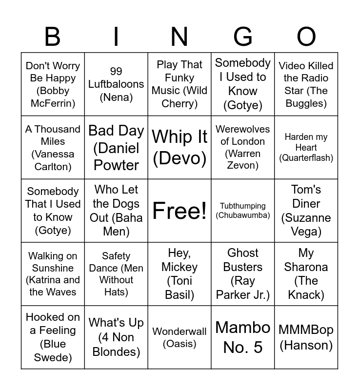 This bingo card has a free space and 40 words: Funky Town (Lipps Inc), Somebody That I Used to Know (Gotye), Never Gonna Give You Up (Risk Astley), Bad Day (Daniel Powter, What's Up (4 Non Blondes), Hey, Mickey (Toni Basil), Whip It (Devo), Ice, Ice Baby (Vanilla Ice), Video Killed the Radio Star (The Buggles), Walking on Sunshine (Katrina and the Waves, Who Let the Dogs Out (Baha Men), Somebody I Used to Know (Gotye), MMMBop (Hanson), Tom's Diner (Suzanne Vega), Tubthumping (Chubawumba), Safety Dance (Men Without Hats), Eye of the Tiger (Survivor), Don't Worry Be Happy (Bobby McFerrin), Dancing in the Moonlight (King Harvest), Play That Funky Music (Wild Cherry), My Sharona (The Knack), Mambo No. 5, Werewolves of London (Warren Zevon), A Thousand Miles (Vanessa Carlton), No Rain (Blind Melon), Barbie Girl (Aqua), Gangnam Style (PSY), Sandstorm (Durade), Crazy Frog (Axl F), Let Her Go (Passengers), It's Raining Men (The Weather Girls), Hooked on a Feeling (Blue Swede), Take on Me (a-ha), Ghost Busters (Ray Parker Jr.), Harden my Heart (Quarterflash), Wonderwall (Oasis), Take My Breath Away (Berlin), Dance Monkey (The Tones and I), 99 Luftbaloons (Nena) and St. Elmo's Fire (John Parr).