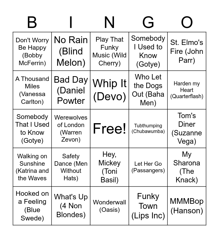 This bingo card has a free space and 40 words: Mambo No. % (Lou Bega), Somebody That I Used to Know (Gotye), Take on Me (a-ha), Bad Day (Daniel Powter, What's Up (4 Non Blondes), Hey, Mickey (Toni Basil), Whip It (Devo), Ice, Ice Baby (Vanilla Ice), St. Elmo's Fire (John Parr), Walking on Sunshine (Katrina and the Waves, Werewolves of London (Warren Zevon), Somebody I Used to Know (Gotye), MMMBop (Hanson), Tom's Diner (Suzanne Vega), Tubthumping (Chubawumba), Safety Dance (Men Without Hats), Crazy Frog (Axl F), Don't Worry Be Happy (Bobby McFerrin), Dancing in the Moonlight (King Harvest), Play That Funky Music (Wild Cherry), My Sharona (The Knack), Funky Town (Lips Inc), Who Let the Dogs Out (Baha Men), A Thousand Miles (Vanessa Carlton), 500 Miles (The Proclaimers), Barbie Girl (Aqua), Gangnam Style (PSY), Sandstorm (Durade), Eye of the Tiger (Survivor), Video Killed the Radio Star (The Buggles), It's Raining Men (The Weather Girls), Hooked on a Feeling (Blue Swede), Never Gonna Give You Up (Rick Astley, Let Her Go (Passangers), Harden my Heart (Quarterflash), Wonderwall (Oasis), Take My Breath Away (Berlin), Dance Monkey (The Tones and I), No Rain (Blind Melon) and O-o-h Child (The Five Stairsteps.
