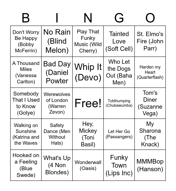 This bingo card has a free space and 40 words: Mambo No. % (Lou Bega), Somebody That I Used to Know (Gotye), Take on Me (a-ha), Bad Day (Daniel Powter, What's Up (4 Non Blondes), Hey, Mickey (Toni Basil), Whip It (Devo), Ice, Ice Baby (Vanilla Ice), St. Elmo's Fire (John Parr), Walking on Sunshine (Katrina and the Waves, Werewolves of London (Warren Zevon), Tainted Love (Soft Cell), MMMBop (Hanson), Tom's Diner (Suzanne Vega), Tubthumping (Chubawumba), Safety Dance (Men Without Hats), Crazy Frog (Axl F), Don't Worry Be Happy (Bobby McFerrin), Dancing in the Moonlight (King Harvest), Play That Funky Music (Wild Cherry), My Sharona (The Knack), Funky Town (Lips Inc), Who Let the Dogs Out (Baha Men), A Thousand Miles (Vanessa Carlton), 500 Miles (The Proclaimers), Barbie Girl (Aqua), Gangnam Style (PSY), Sandstorm (Durade), Eye of the Tiger (Survivor), Video Killed the Radio Star (The Buggles), It's Raining Men (The Weather Girls), Hooked on a Feeling (Blue Swede), Never Gonna Give You Up (Rick Astley, Let Her Go (Passangers), Harden my Heart (Quarterflash), Wonderwall (Oasis), The Safety Dance (Men Without Hats), Dance Monkey (The Tones and I), No Rain (Blind Melon) and O-o-h Child (The Five Stairsteps.