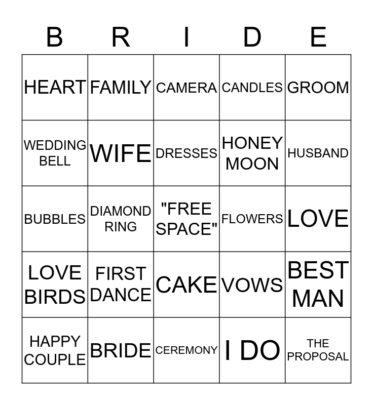 This bingo card has a free space and 24 words: FIRST DANCE, BRIDE, DRESSES, HAPPY COUPLE, GROOM, HEART, WEDDING BELL, FAMILY, FLOWERS, CAKE, HONEY MOON, BUBBLES, VOWS, BEST MAN, WIFE, I DO, LOVE, CAMERA, HUSBAND, DIAMOND RING, THE PROPOSAL, LOVE BIRDS, CANDLES and CEREMONY.