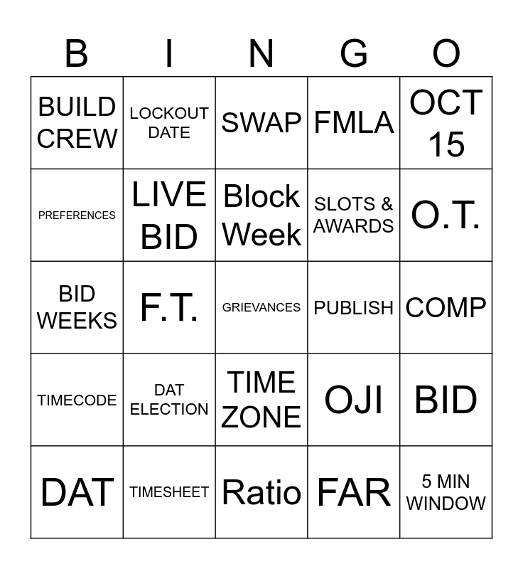 This bingo card has 25 words: DAT ELECTION, Ratio, Block Week, DAT, OCT 15, BUILD CREW, PREFERENCES, LOCKOUT DATE, PUBLISH, TIME ZONE, SLOTS & AWARDS, BID WEEKS, OJI, BID, LIVE BID, 5 MIN WINDOW, COMP, SWAP, O.T., F.T., GRIEVANCES, TIMESHEET, TIMECODE, FMLA and FAR.
