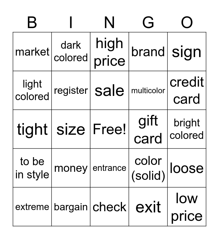 This bingo card has a free space and 26 words: entrance, exit, sale, bargain, sign, market, light colored, dark colored, bright colored, color (solid), multicolor, tight, loose, extreme, size, shoe size, brand, to be in style, high price, low price, credit card, check, gift card, money, register and cashier.