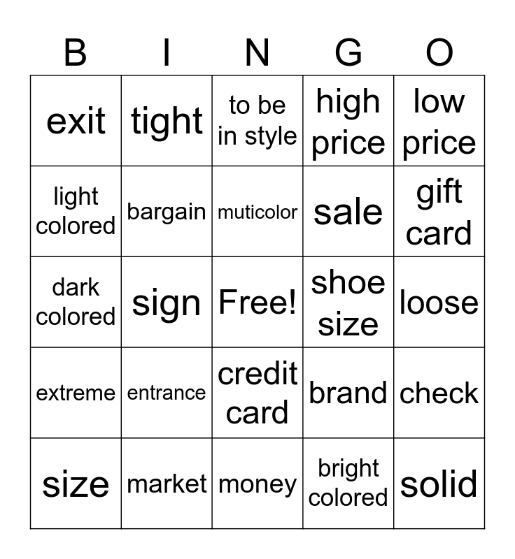 This bingo card has a free space and 24 words: entrance, market, muticolor, size, low price, exit, light colored, tight, shoe size, credit card, sale, dark colored, brand, check, bargain, bright colored, loose, to be in style, gift card, sign, solid, extreme, high price and money.
