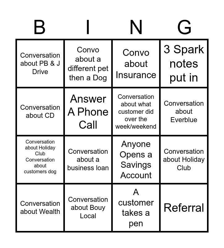 This bingo card has 16 words: Conversation about Bouy Local, Conversation about Holiday Club, Convo about Insurance, Conversation about PB & J Drive, Conversation about Holiday Club Conversation about customers dog, Convo about a different pet then a Dog, Anyone Opens a Savings Account, A customer takes a pen, Conversation about CD, Answer A Phone Call, Conversation about Wealth, 3 Spark notes put in, Conversation about a business loan, Conversation about Everblue, Conversation about what customer did over the week/weekend and Referral.