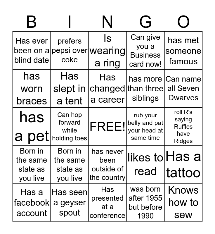 This bingo card has a free space and 24 words: Born in the same state as you live, Has seen a geyser spout, Has changed a career, Has a facebook account, has met someone famous, Has ever been on a blind date, has worn braces, prefers pepsi over coke, rub your belly and pat your head at same time, has never been outside of the country, has more than three siblings, has a pet, likes to read, Has a tattoo, Has slept in a tent, was born after 1955 but before 1990, roll R's saying Ruffles have Ridges, Is wearing a ring, Can name all Seven Dwarves, Can hop forward while holding toes, Knows how to sew, Born in the same state as you live, Can give you a Business card now! and Has presented at a conference.