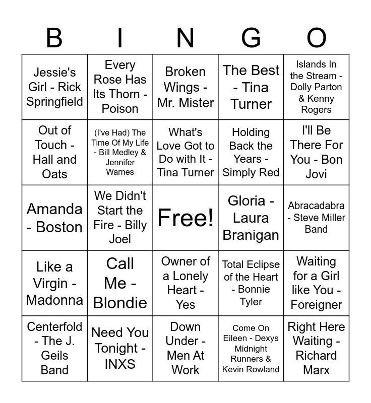 This bingo card has a free space and 50 words: Gimme All Your Lovin' - ZZ Top, Right Here Waiting - Richard Marx, Hurts So Good - John Mellencamp, Down Under - Men At Work, Call Me - Blondie, We Built This City - Starship, Every Rose Has Its Thorn - Poison, Part-Time Lover - Stevie Wonder, Out of Touch - Hall and Oats, Jack & Diane - John Mellencamp, (I've Had) The Time Of My Life - Bill Medley & Jennifer Warnes, The Best - Tina Turner, Waiting for a Girl like You - Foreigner, Total Eclipse of the Heart - Bonnie Tyler, Got My Mind Set on You - George Harrison, Photograph - Def Leppard, What's Love Got to Do with It - Tina Turner, Gloria - Laura Branigan, We Are The World - U.S.A. For Africa, Islands In the Stream - Dolly Parton & Kenny Rogers, We Didn't Start the Fire - Billy Joel, Come On Eileen - Dexys Midnight Runners & Kevin Rowland, Jessie's Girl - Rick Springfield, Holding Back the Years - Simply Red, The Way You Make Me Feel - Michael Jackson, Another One Bites The Dust - Queen, I'll Be There For You - Bon Jovi, Material Girl - Madonna, Broken Wings - Mr. Mister, Owner of a Lonely Heart - Yes, I Still Haven't Found What I'm Looking For - U2, My Prerogative - Bobby Brown, I'm Coming Out - Diana Ross, Man in the Mirror - Michael Jackson, Need You Tonight - INXS, Wake Me Up Before You Go-Go - Wham!, One More Try - George Michael, Sussudio - Phil Collins, Sledgehammer - Peter Gabriel, Abracadabra - Steve Miller Band, Faith - George Michael, Can't Fight This Feeling - REO Speedwagon, The Way It Is - Bruce Hornsby & The Range, Every Little Thing She Does Is Magic - The Police, Centerfold - The J. Geils Band, Amanda - Boston, Born in the U.S.A. - Bruce Springsteen, Venus - Bananarama, Like a Virgin - Madonna and How Will I Know - Whitney Houston.
