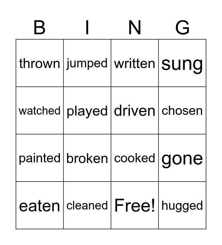 This bingo card has 17 words: Free!, eaten, written, thrown, broken, sung, gone, driven, chosen, played, cleaned, cooked, watched, jumped, painted, closed and hugged.