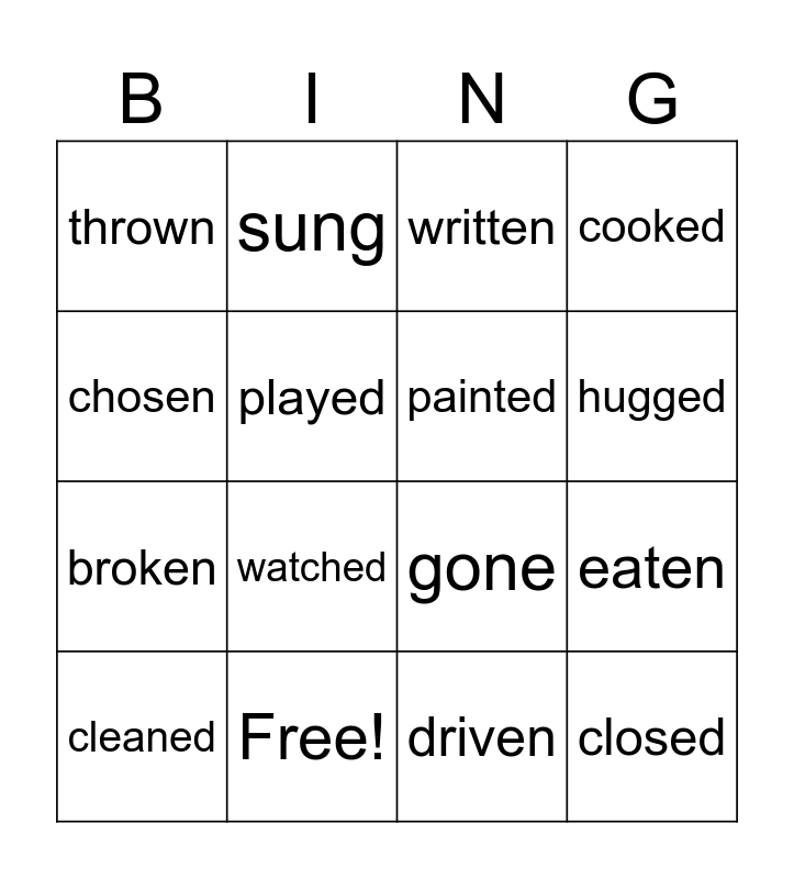 This bingo card has 16 words: Free!, eaten, written, thrown, broken, sung, gone, driven, chosen, played, cleaned, cooked, watched, hugged, painted and closed.