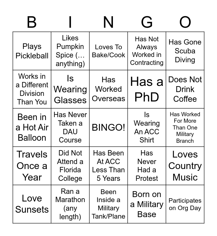 This bingo card has a free space and 24 words: Did Not Attend a Florida College, Ran a Marathon (any length), Has Worked Overseas, Love Sunsets, Has Gone Scuba Diving, Plays Pickleball, Works in a Different Division Than You, Likes Pumpkin Spice (…anything), Is Wearing An ACC Shirt, Has Been At ACC Less Than 5 Years, Has a PhD, Been in a Hot Air Balloon, Has Never Had a Protest, Loves Country Music, Is Wearing Glasses, Born on a Military Base, Has Worked For More Than One Military Branch, Loves To Bake/Cook, Does Not Drink Coffee, Has Never Taken a DAU Course, Participates on Org Day, Travels Once a Year, Has Not Always Worked in Contracting and Been Inside a Military Tank/Plane.