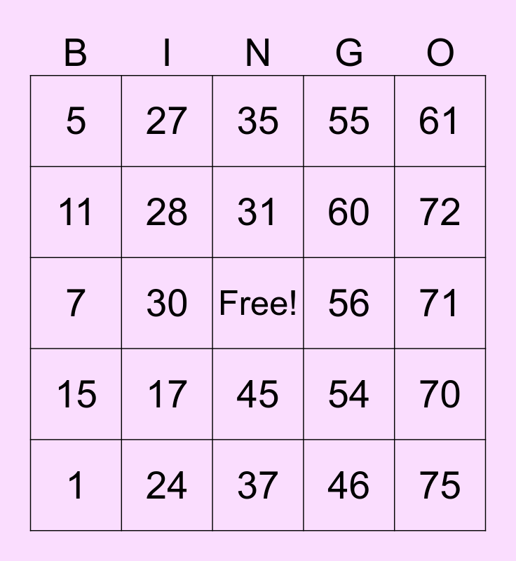 This bingo card has a free space and 24 words: 1, 17, 31, 46, 61, 5, 27, 35, 56, 71, 7, 28, 54, 70, 11, 24, 37, 55, 72, 15, 30, 45, 60 and 75.